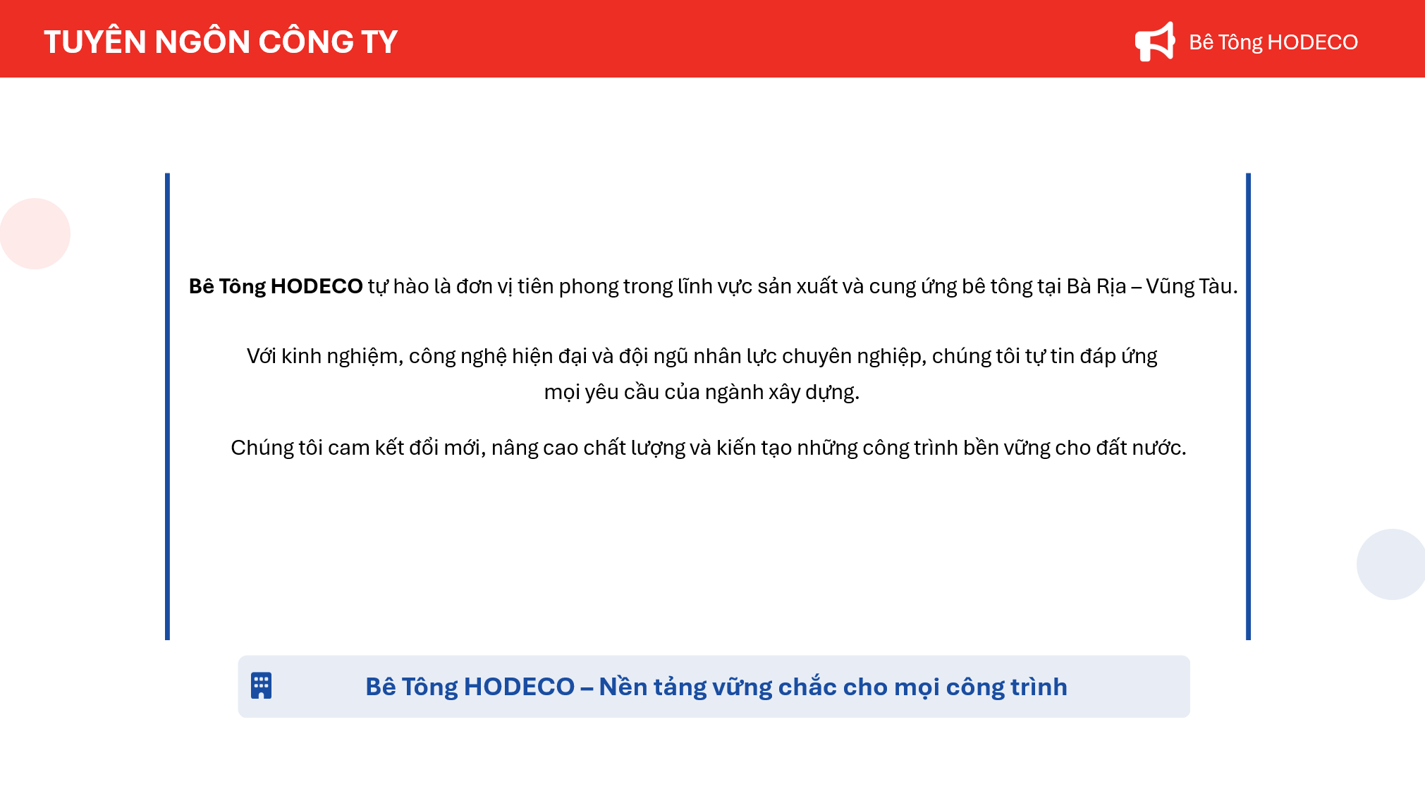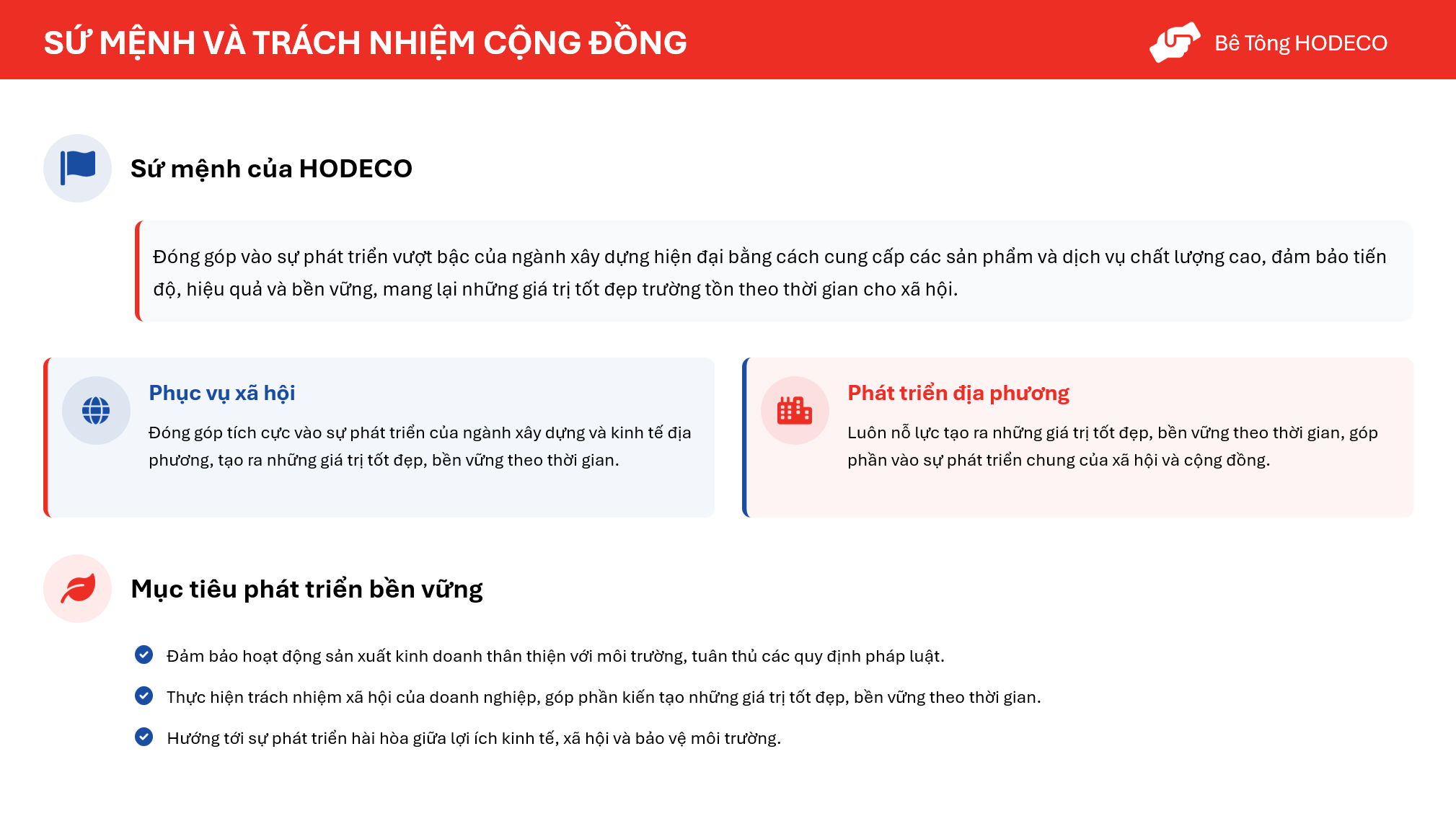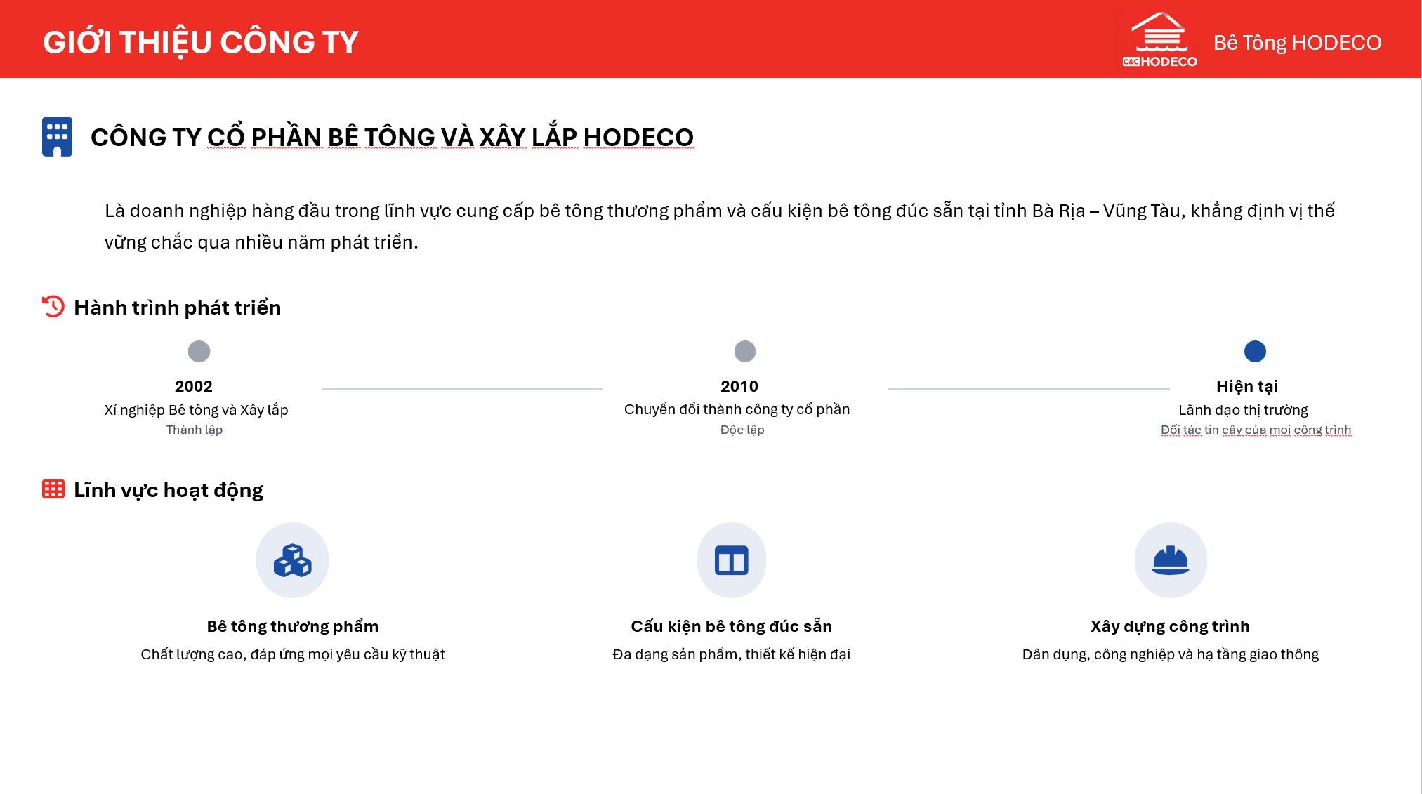 Công ty Cổ phần Bê tông và Xây lắp Hodeco (HODECO) là một doanh nghiệp đã khẳng định được vị thế hàng đầu trong lĩnh vực cung cấp bê tông thương phẩm và cấu kiện bê tông đúc sẵn tại tỉnh Bà Rịa – Vũng Tàu. Văn hóa doanh nghiệp của HODECO được xây dựng dựa trên sự hội tụ đầy đủ các yếu tố cốt lõi,đặt mục tiêu phát triển bền vững và cam kết trách nhiệm với xã hội.