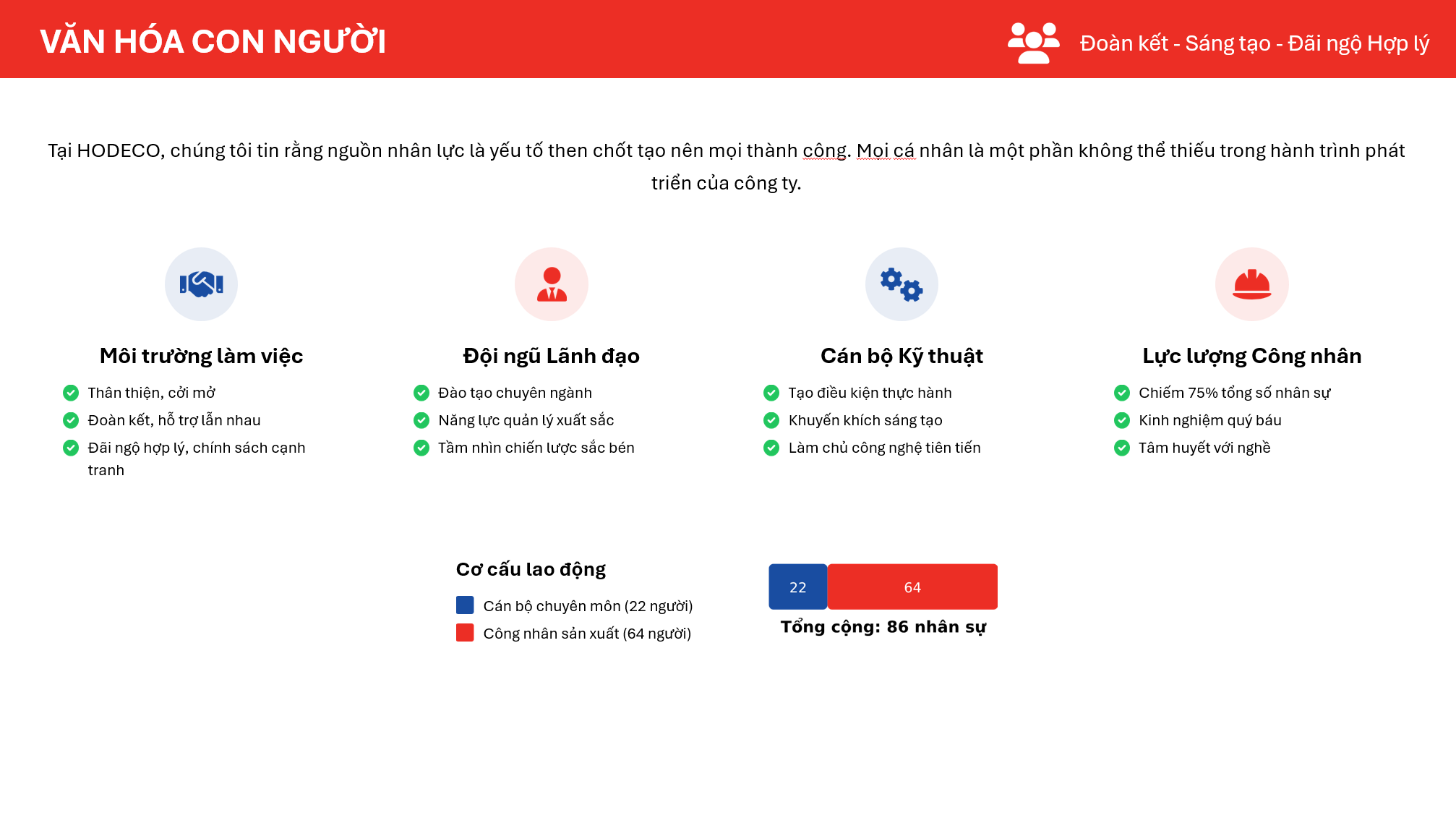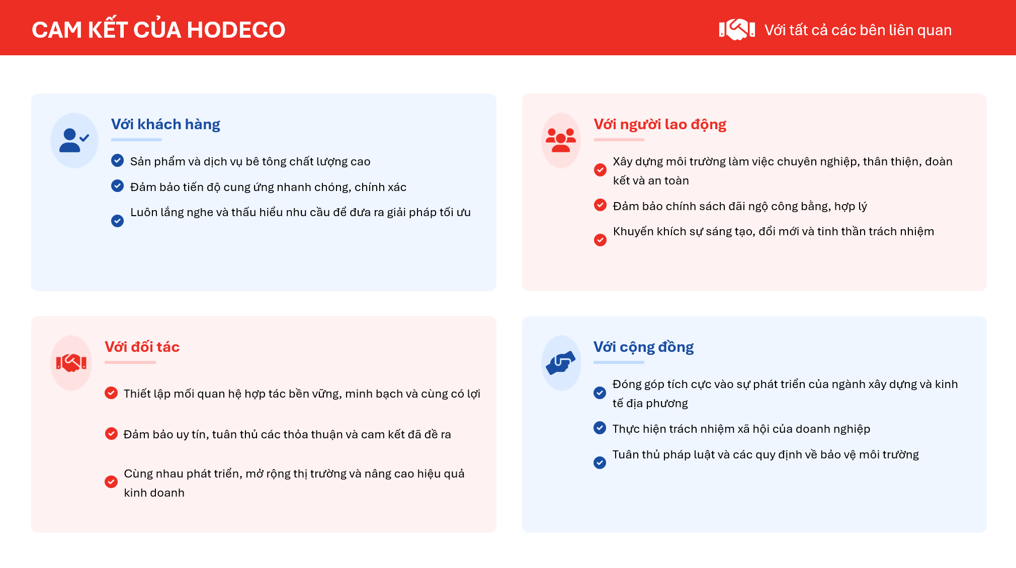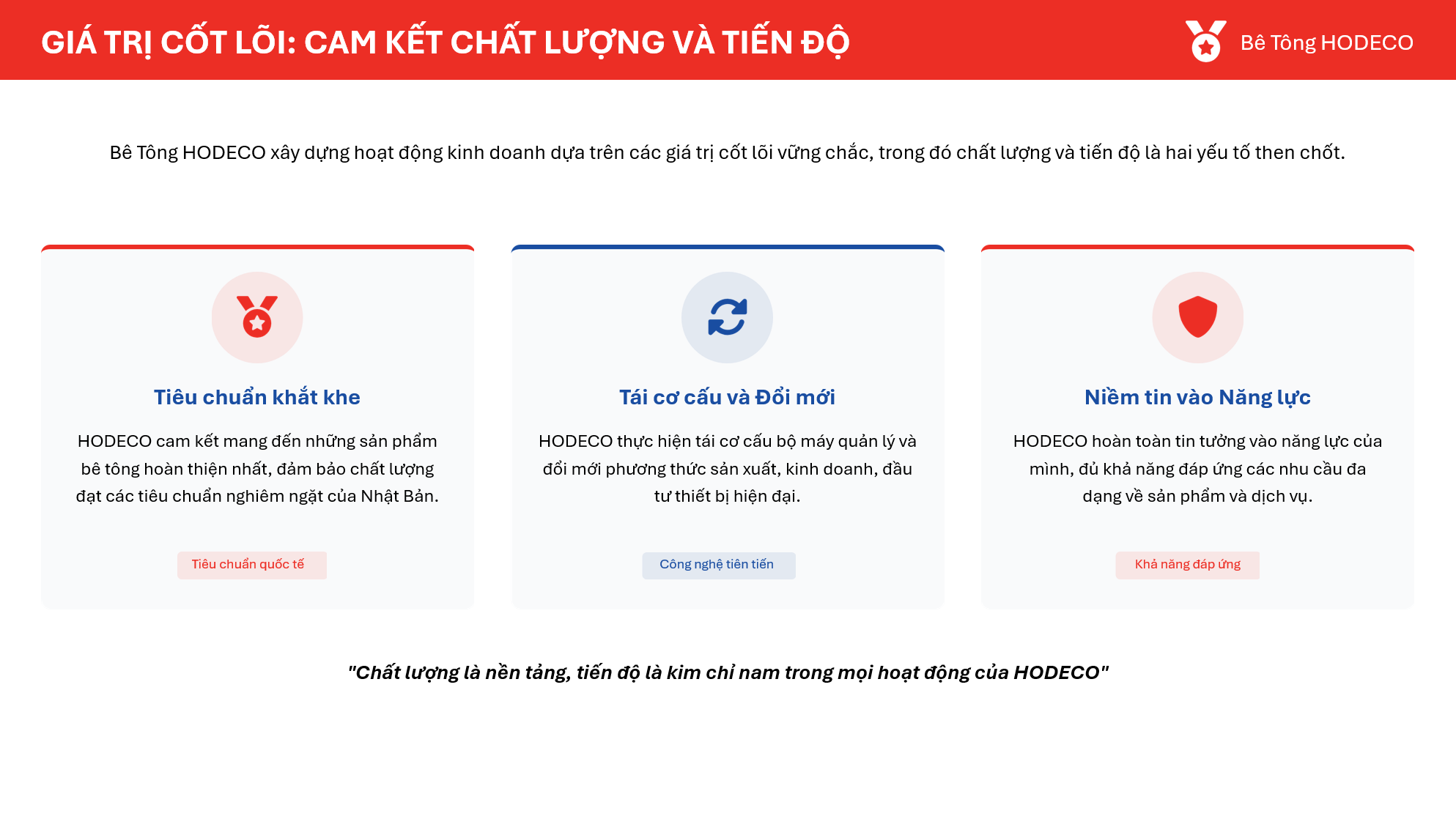 Công ty Cổ phần Bê tông và Xây lắp Hodeco (HODECO) là một doanh nghiệp đã khẳng định được vị thế hàng đầu trong lĩnh vực cung cấp bê tông thương phẩm và cấu kiện bê tông đúc sẵn tại tỉnh Bà Rịa – Vũng Tàu. Văn hóa doanh nghiệp của HODECO được xây dựng dựa trên sự hội tụ đầy đủ các yếu tố cốt lõi,đặt mục tiêu phát triển bền vững và cam kết trách nhiệm với xã hội.
